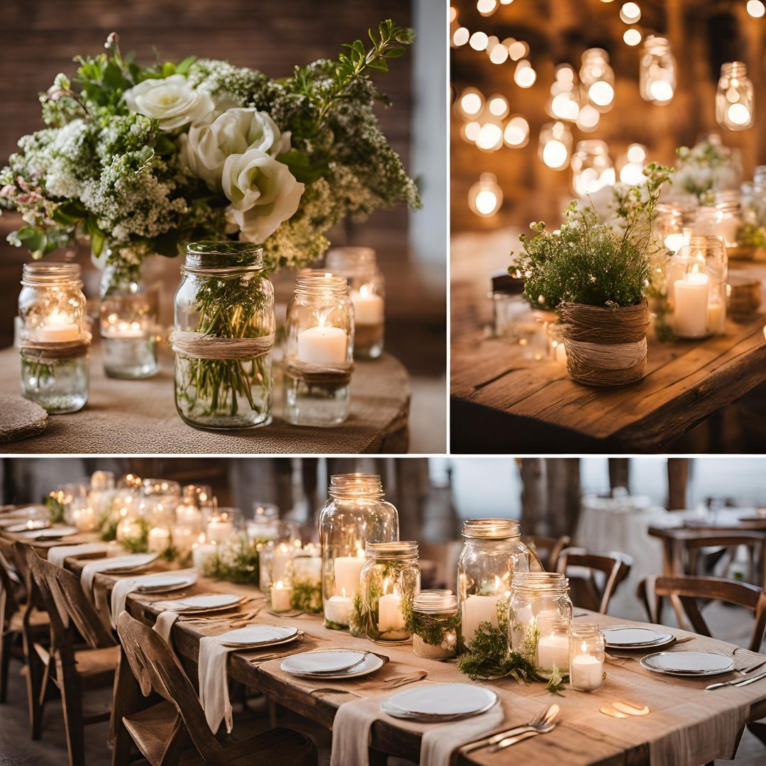 Puoi usare fiori di stagione o oggetti come boccacci di vetro, candele e legno riciclato per creare un'atmosfera romantica e sostenibile.